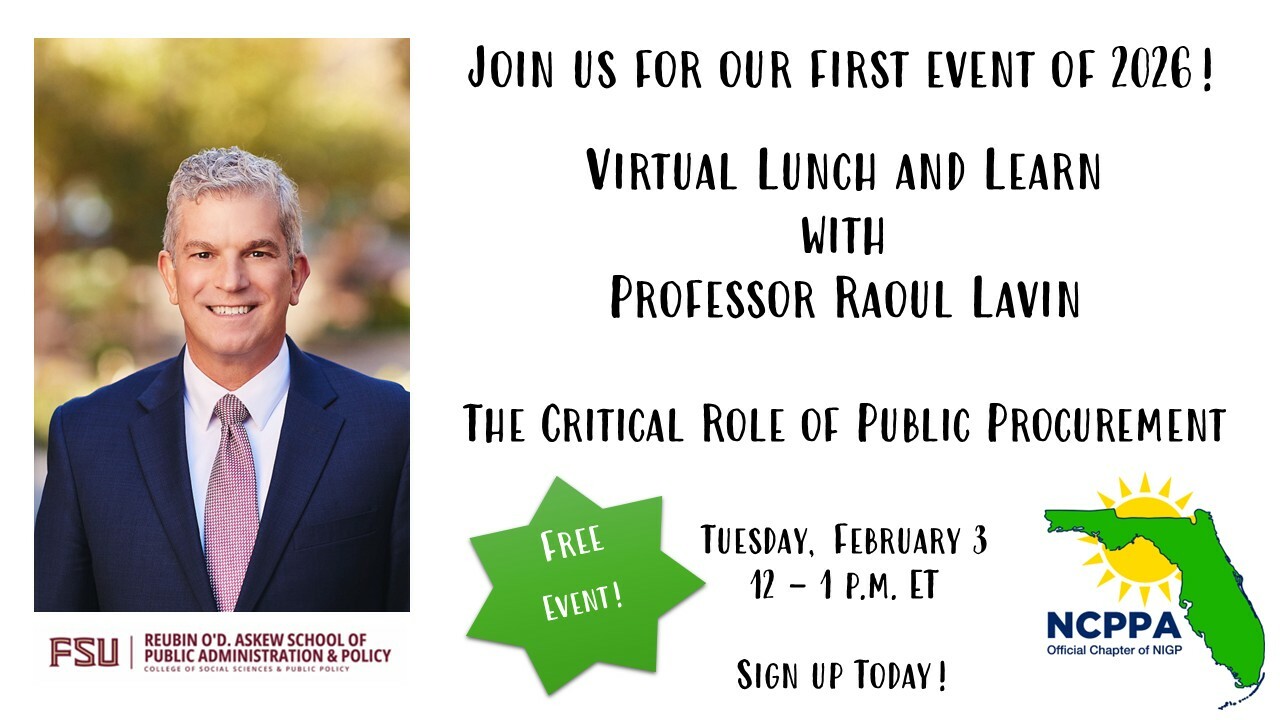 Please join the Nature Coast Public Purchasing Association for our first event of 2026, where we will be giving you an update on our Chapter's development and discussing The Critical Role of Public Procurement with Professor Raoul Lavin.